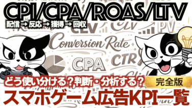 スマホゲーム広告で使うKPIを一覧でまとめ、CPI・CPA・ROAS・LTVの違いと使い分けを解説。確認する順番、判断時の注意点、ゲーム事業とのつながりまで、マーケ責任者向けにまとめています。