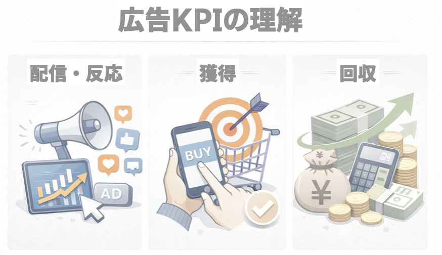 広告KPIは、大きく次の3つに分けて考えると理解しやすくなります。