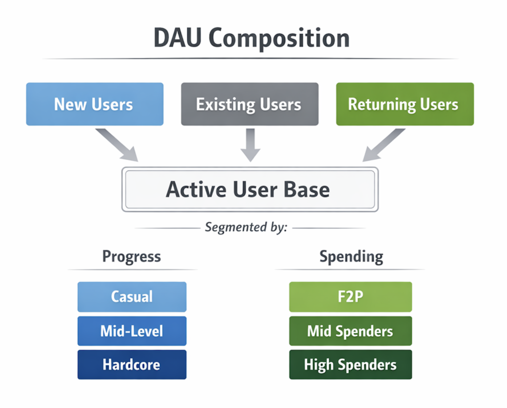 DAUは「新規ユーザー」「既存ユーザー」「復帰ユーザー」の3つから構成されます。