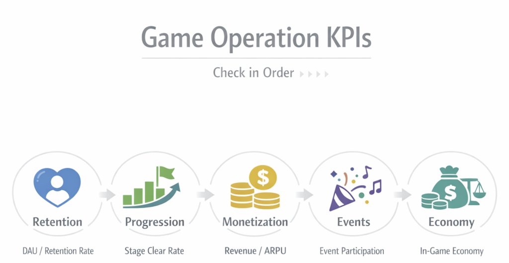 ゲーム運営KPIは、次の順番で確認すると分析しやすくなります。